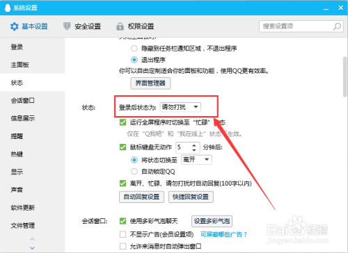 在根基設置頁面,選擇登錄后狀況為請勿打攪。