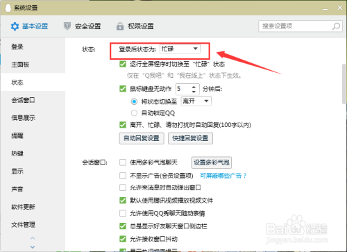 在狀況頁面,選擇“登錄后狀況為忙碌”選項。