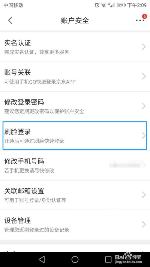 進入賬戶平安界面,點擊“刷臉登錄”選項。