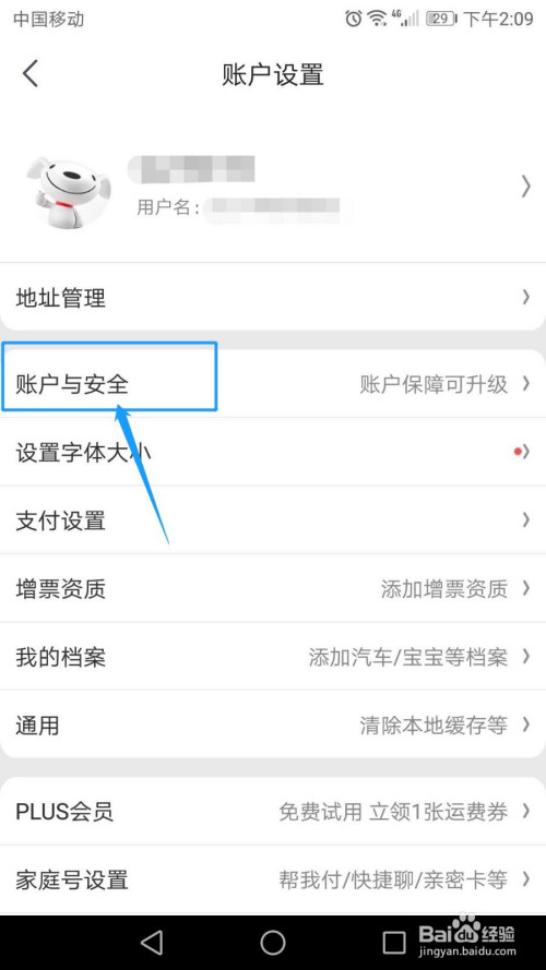 進入賬戶設置界面,點擊“賬戶與平安”的選項。