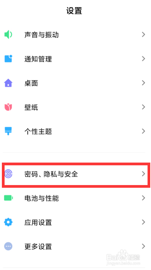 2. 在設置頁面點擊“暗碼、隱私與平安”進入設置手機的指紋解鎖功能