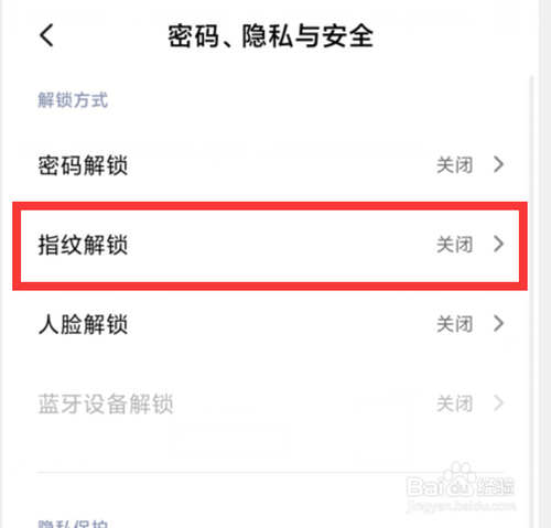 點擊開啟“指紋解鎖”,錄入指紋,這樣手機就設置了指紋解鎖功能