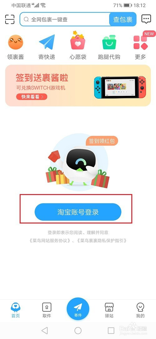 第二步進去菜鳥裹裹之后,點擊淘寶賬號登錄,如下圖所示: