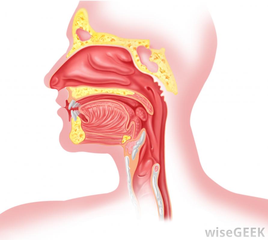 人類頭部(包括喉嚨)的橫切面。嚴重喉嚨痛,疼痛和腫脹明顯。病人可能呼吸困難,喉嚨周圍的淋巴結可明顯腫大有時可觀察到耳痛、頸部僵硬、皮疹、喉嚨膿液、痰帶血、關節疼痛等癥狀。患者還伴有高溫,超過101華氏度(38.3攝氏度)。發燒可能伴有出汗和寒戰